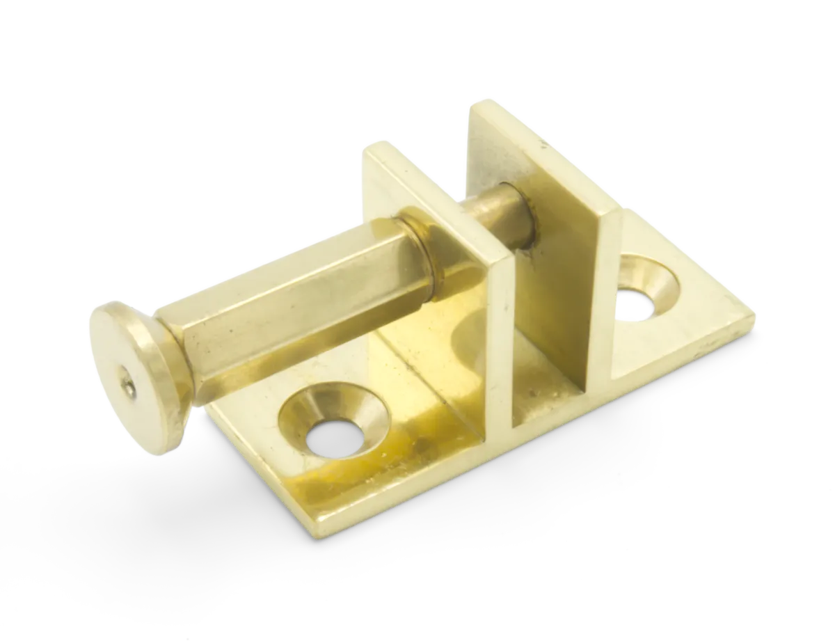 A small end/vent bracket with a plunger style mounting pin finished in brass. This bracket is part of the telescopic screwjack small bracket set.