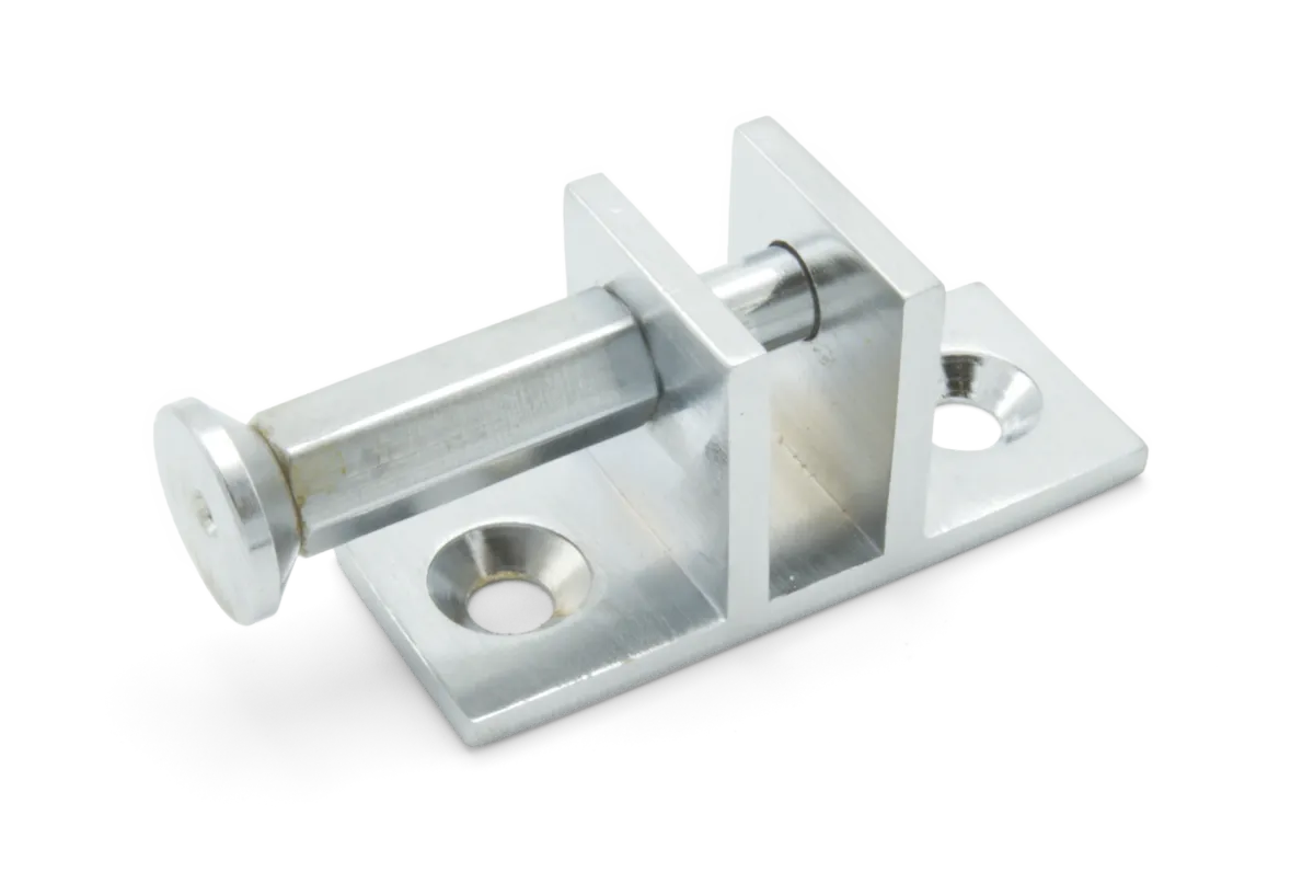 A small end/vent bracket with a plunger style mounting pin finished in satin chrome. This bracket is part of the telescopic screwjack small bracket set.