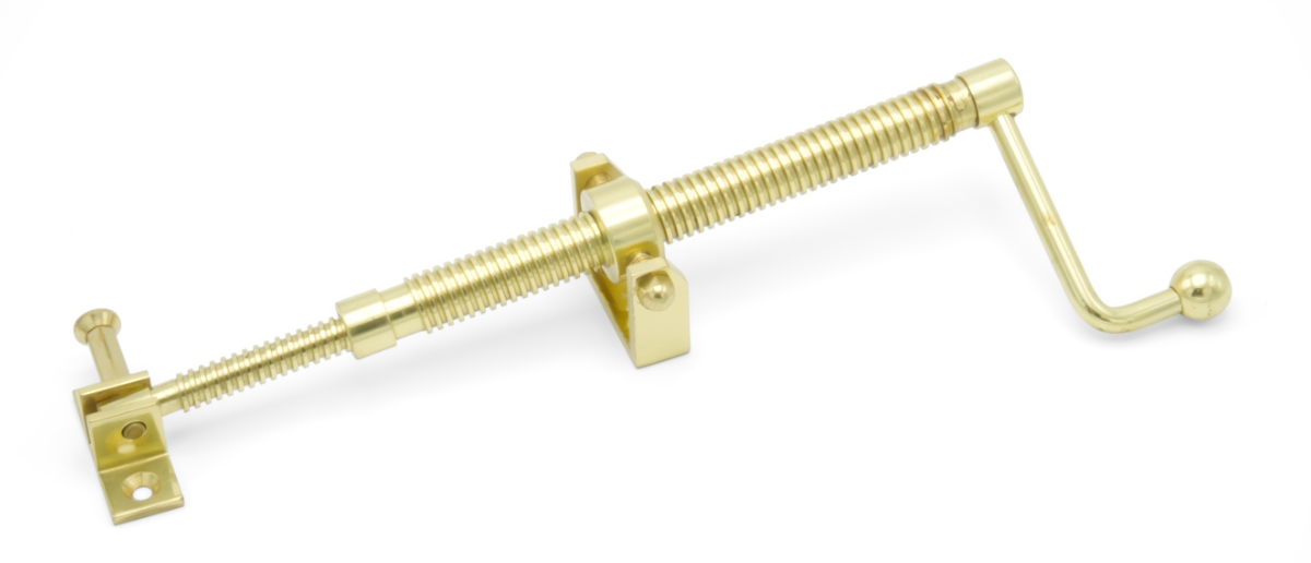 Handle style long telescopic screwjack with with small brackets and a polished brass finish.