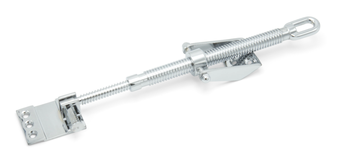 Long telescopic screwjack with with large brackets and a polished chrome finish.