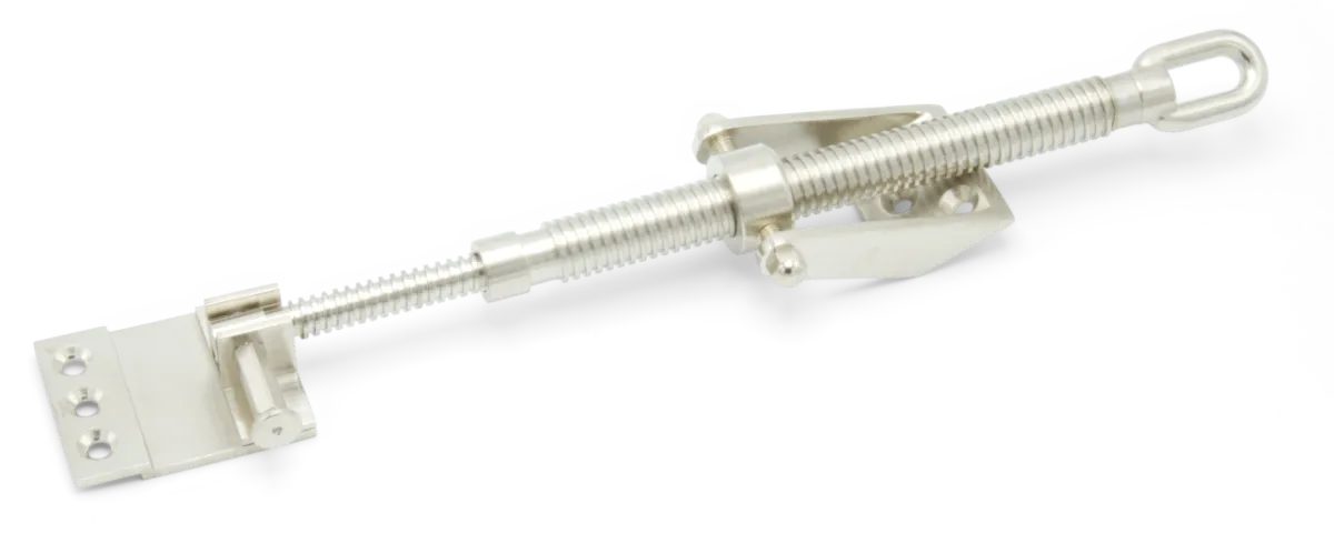 Long telescopic screwjack with with large brackets and a satin nickel finish.