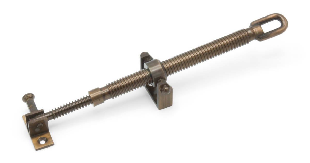 Long telescopic screwjack with with small brackets and a bronze finish.
