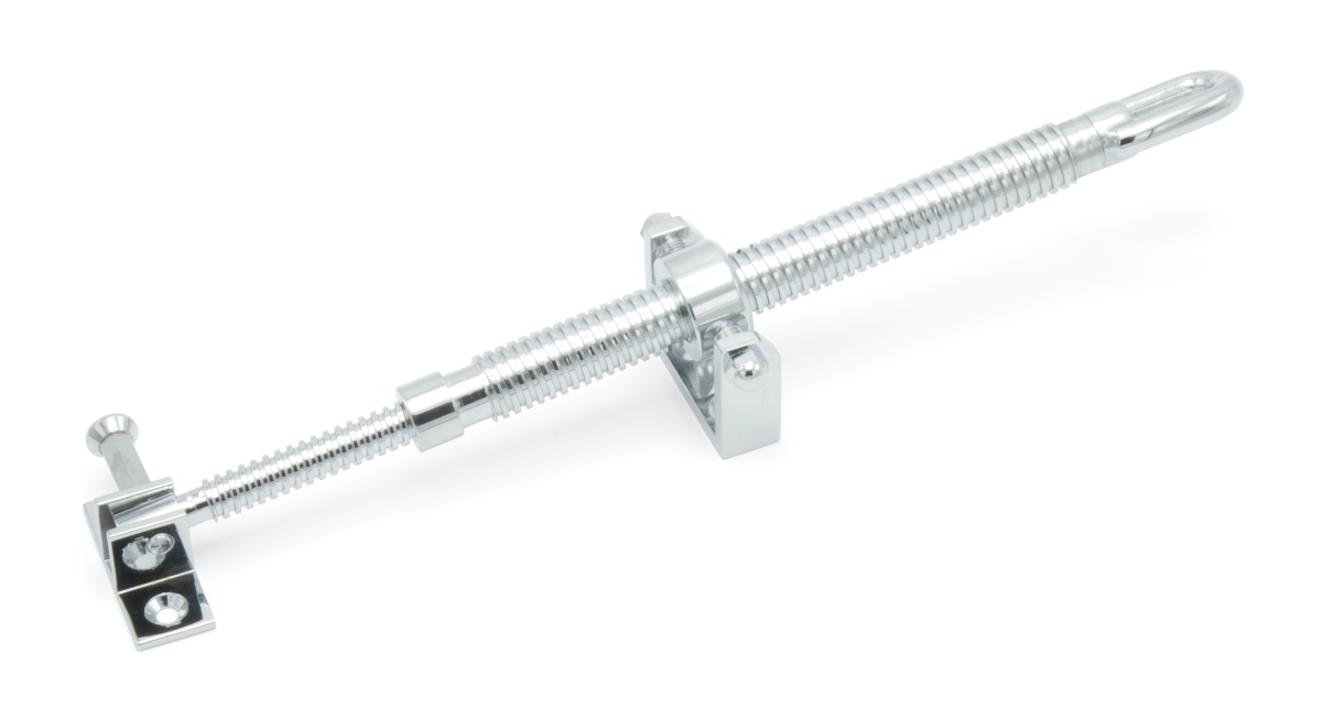 Long telescopic screwjack with with small brackets and a polished chrome finish.