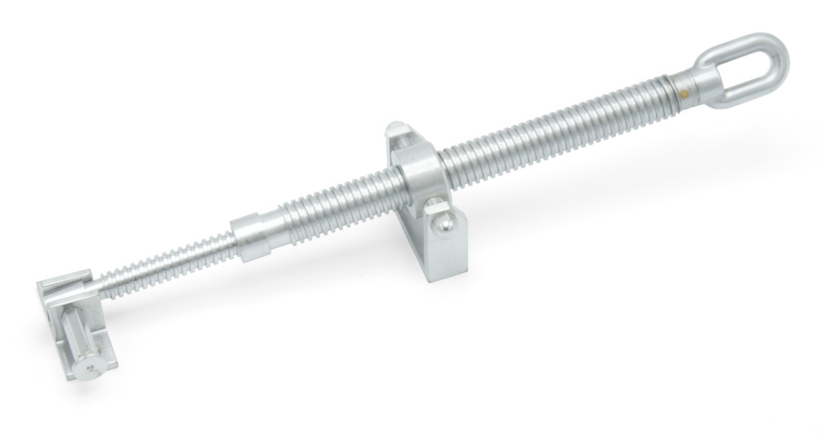 Long telescopic screwjack with with small brackets and a satin chrome finish.