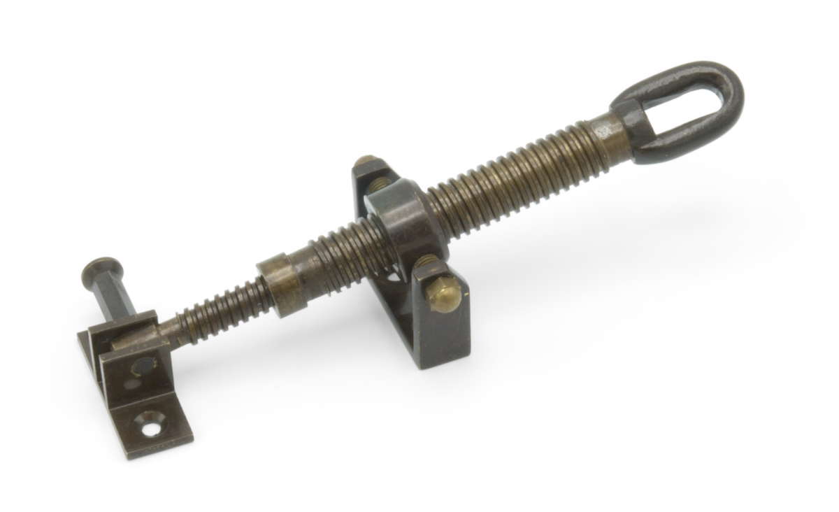 Short telescopic screwjack with with small brackets and a bronze finish.
