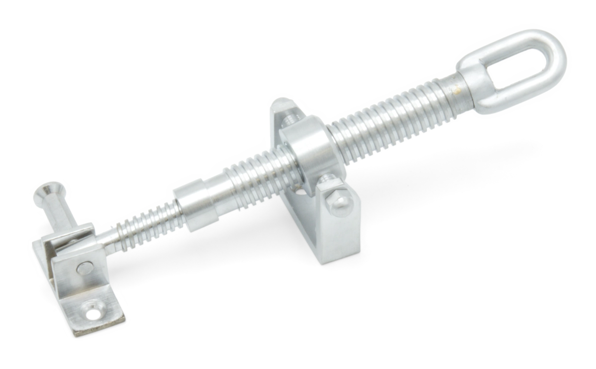 Short telescopic screwjack with with small brackets and a satin chrome finish.